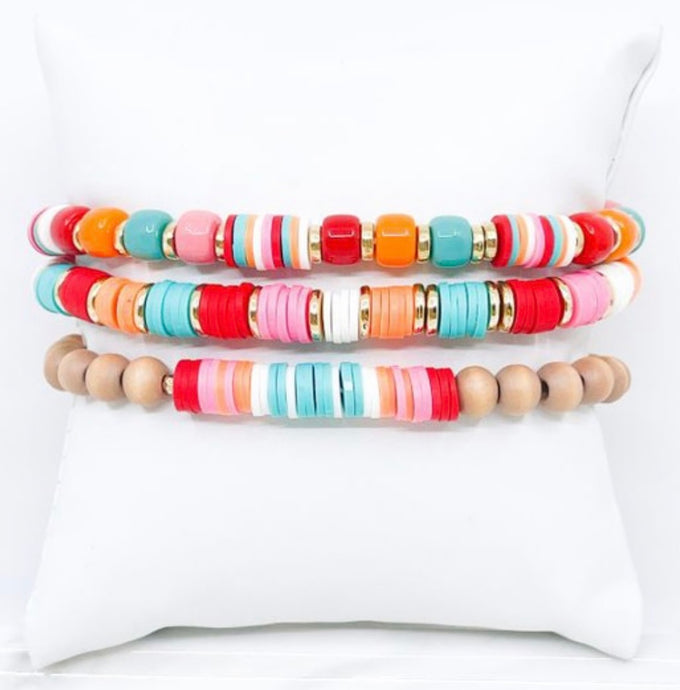Multicolor Three Strand Rubber Disc and Wood Stretch Bracelet